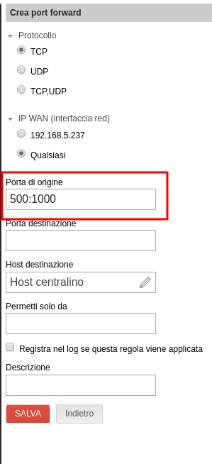 In questo modo tutte le porte dalla 500 alla 1000 saranno girate automaticamente verso la 500 e la 1000 dell' host che nell' esempio รจ chiamato "centralino".