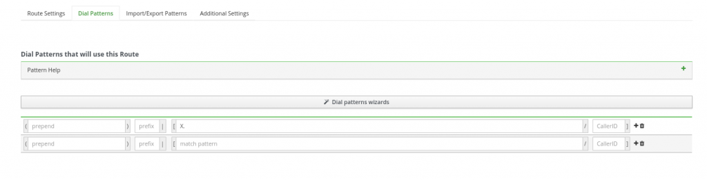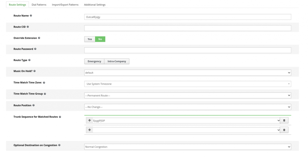 di seguito i Dial pattern molto generico configurato sull'unica rotta in uscita. Infatti tutte le chiamate verso l'esterno con il dialplan con pattern X. vengono inviate automaticamente ad Epygi che si occuperà di gestire l'invio alla linea telefonica:
