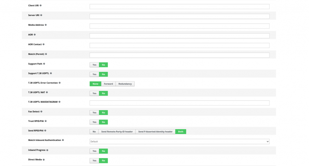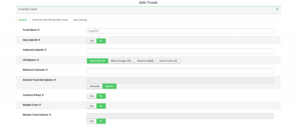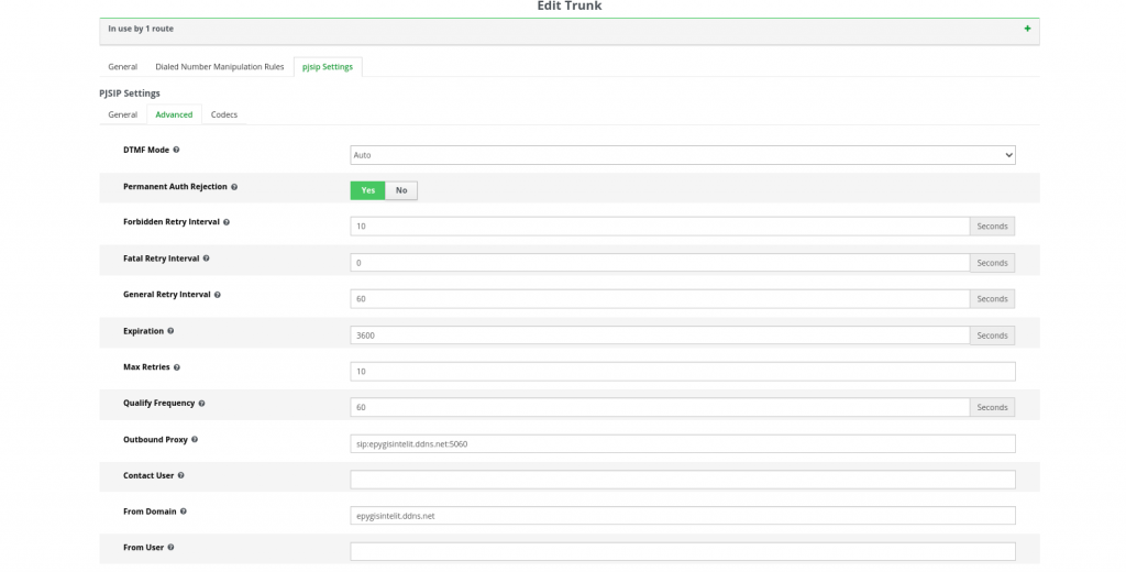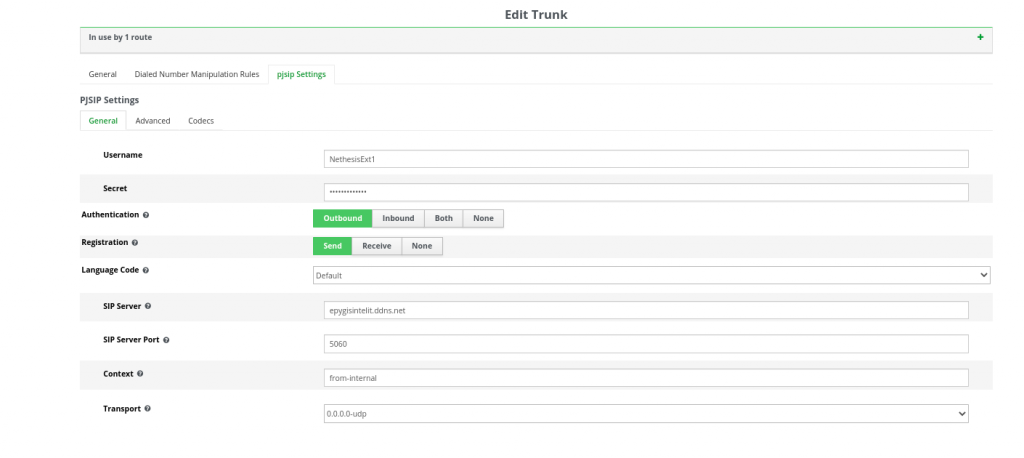 Il trunk presenta le configurazioni presenti sugli screenshot seguenti con registrazione outbound su un interno di Epygi.