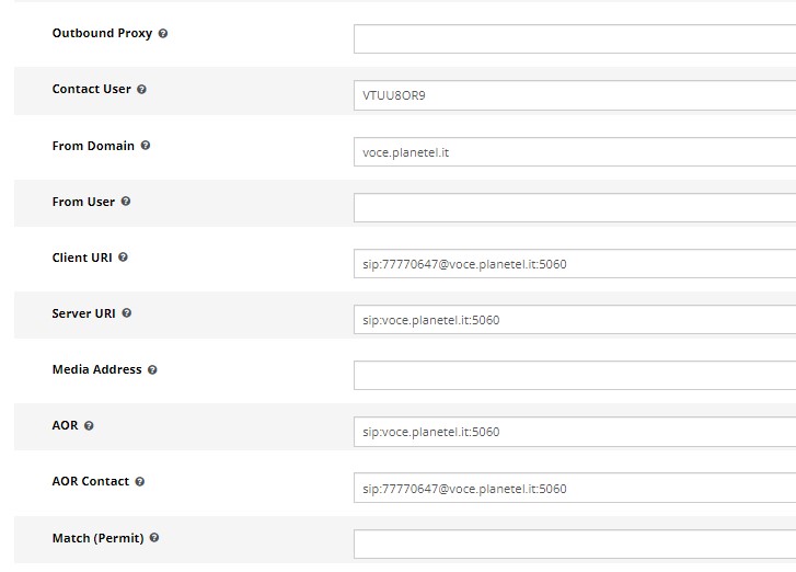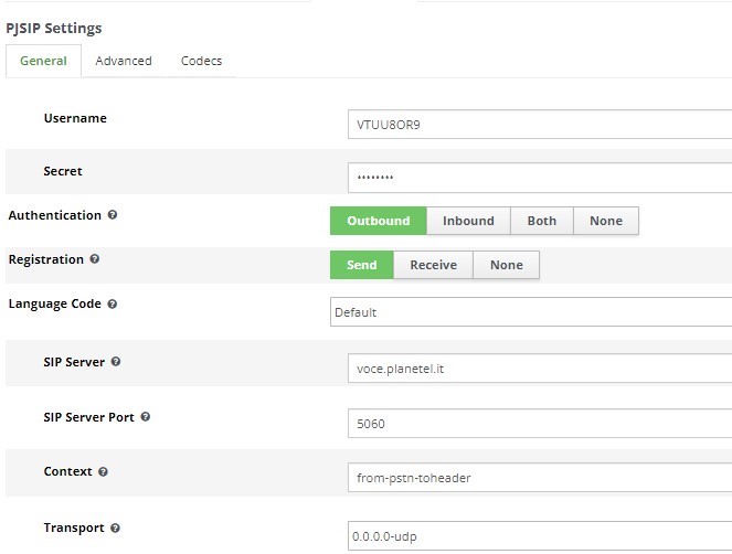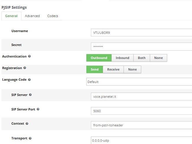 Il provider fornisce questi dati per la configurazione in Pjsip: