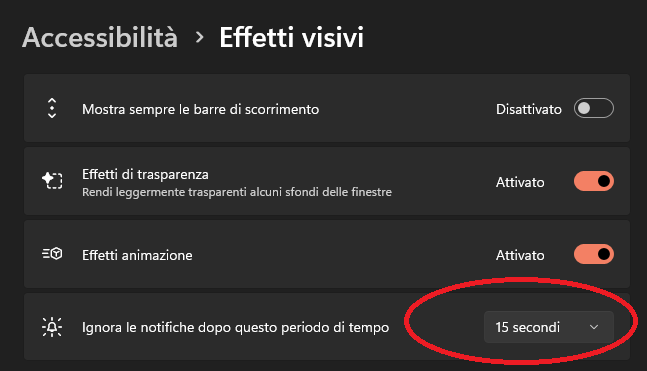 Impostazioni -> Accessibilità -> Schermo -> Mostra Notifiche per -> si seleziona il tempo